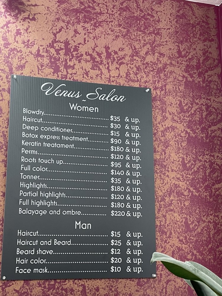 Venus Salon offers amenities such as Wheelchair Accessible, Street Parking, Parking Garage, Good for Kids, Free Wi-Fi, Accepts Credit Cards, Accepts Contactless Payments, ensuring a comfortable and convenient experience for clients.